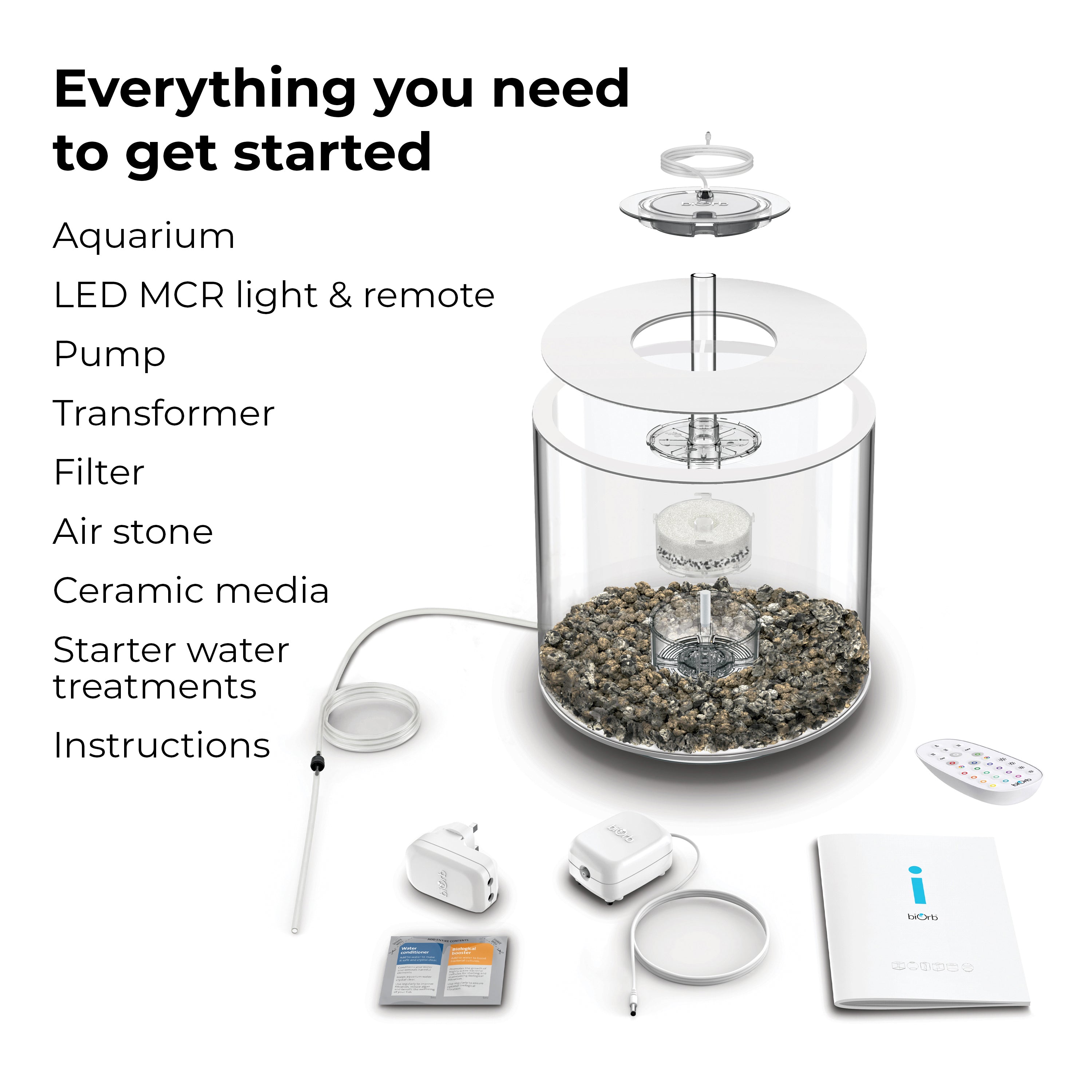 - Included with each biOrb aquarium: Aquarium, air pump, LED lighting, transformer, water treatments, air stone, filter cartridge, ceramic media, and instruction manual