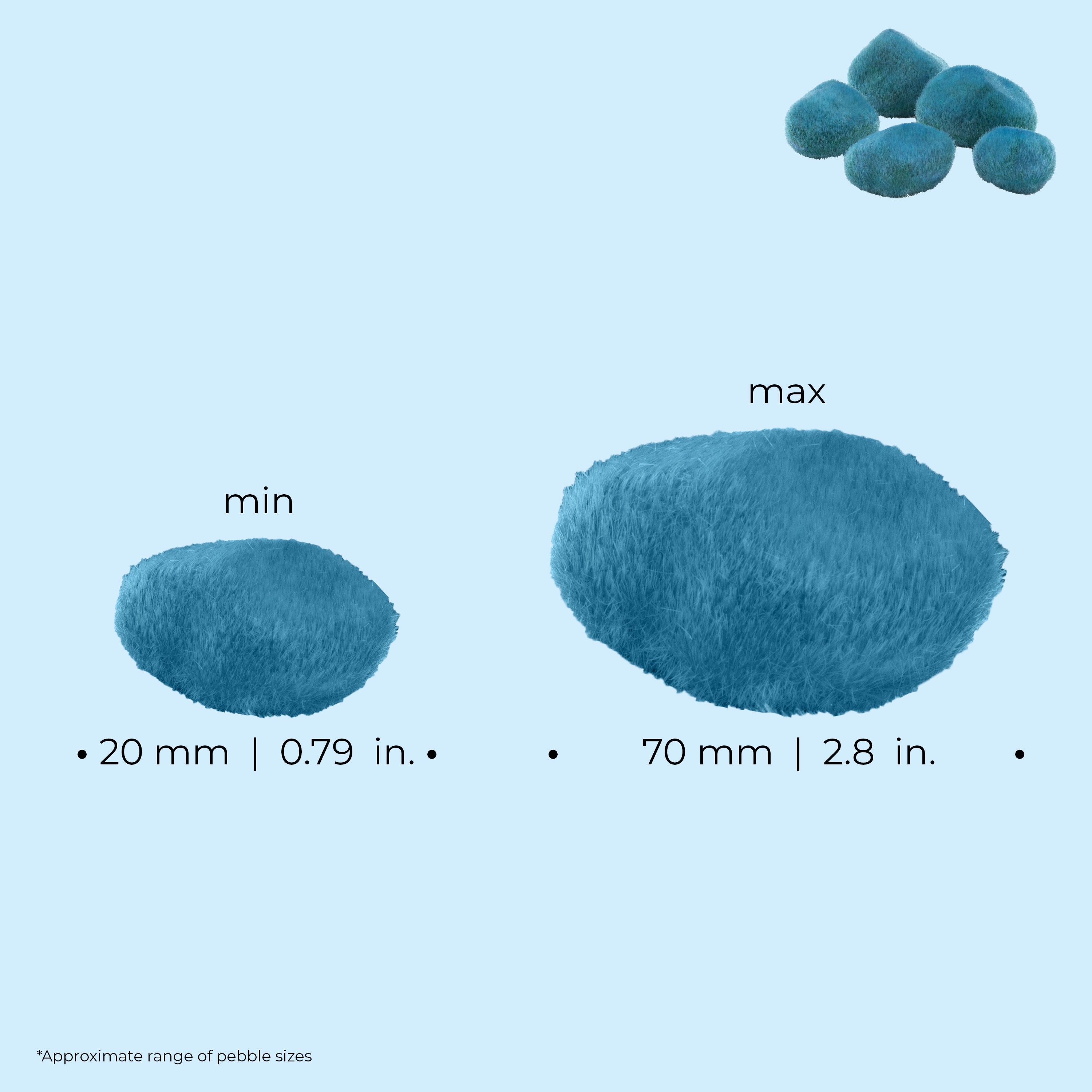 - Dimensions: Maximum pebble size is 2.7 x 1.8 x 1.6 in. / 7 x 4.5 x 4 cm